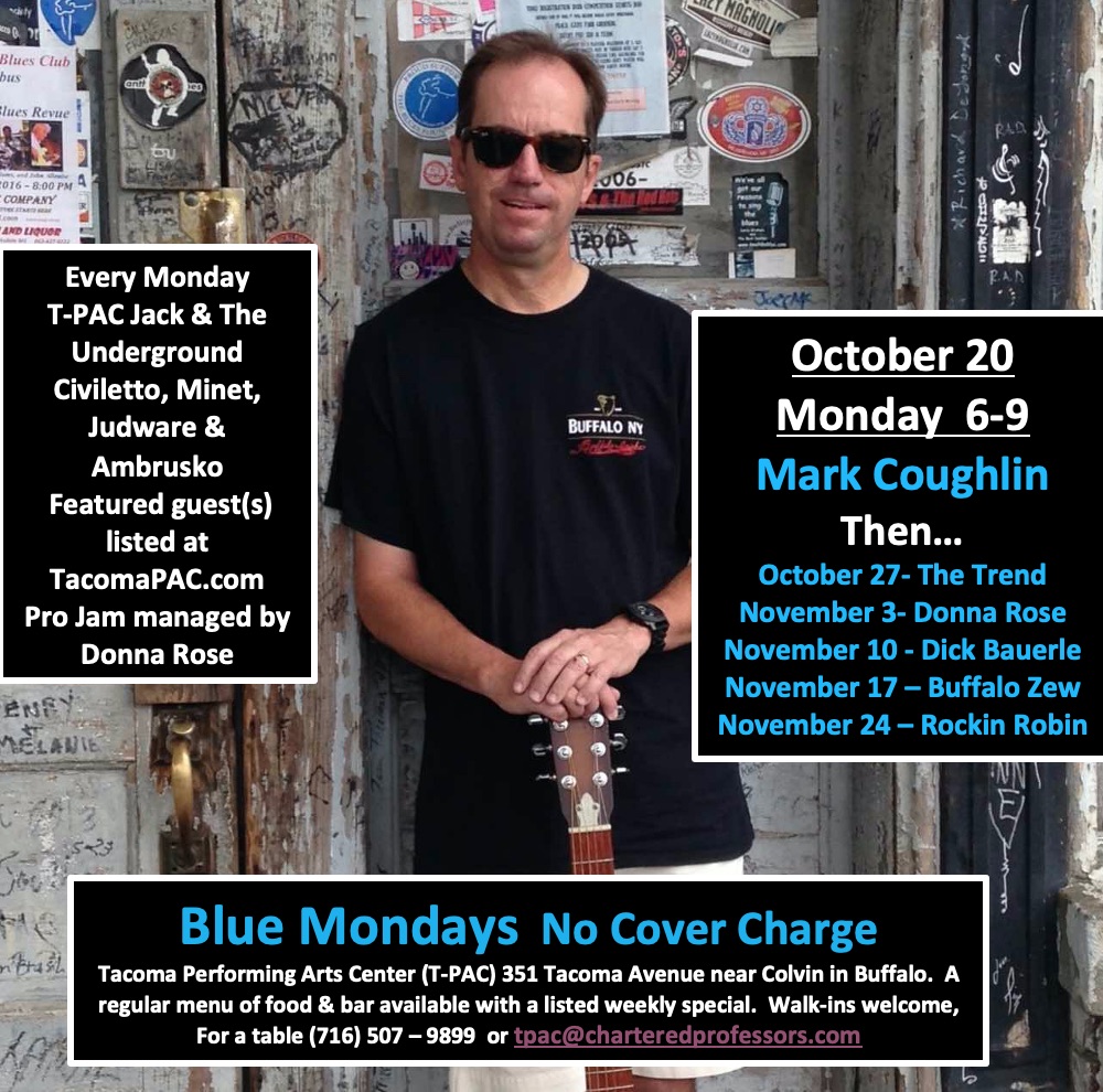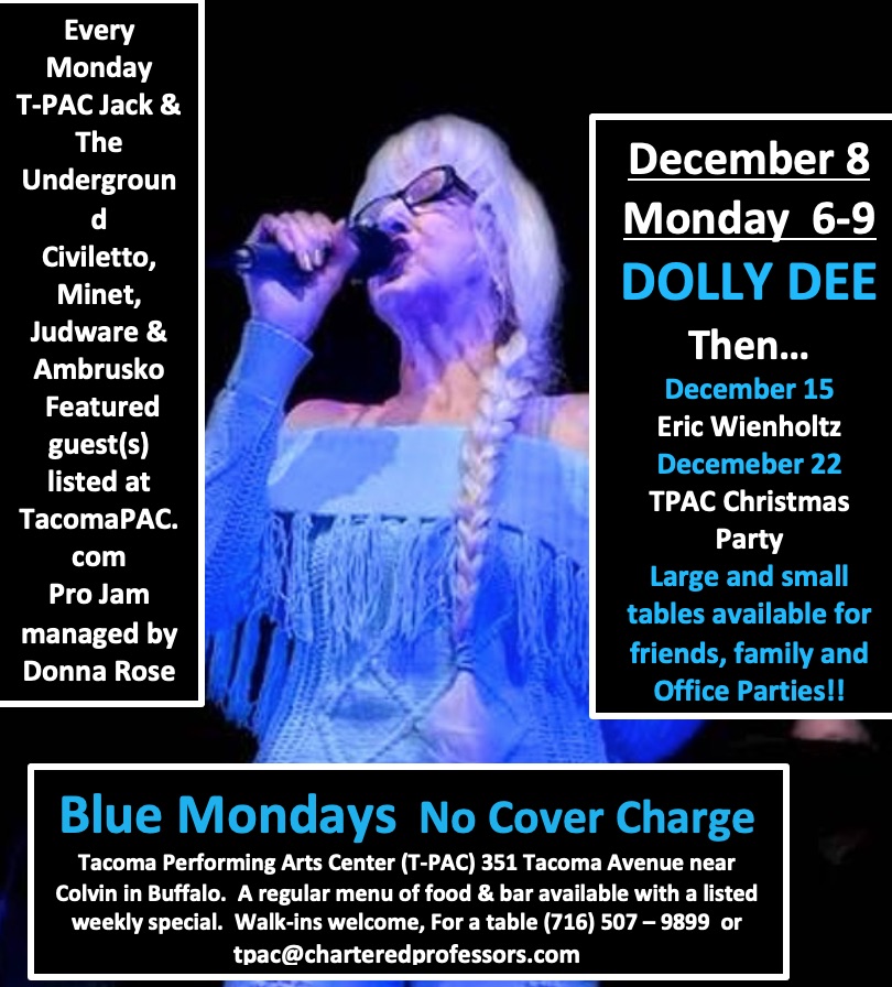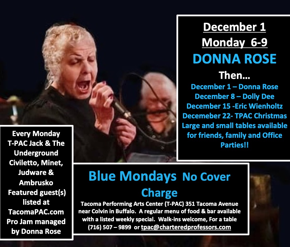 Join us each Monday in the Grand Room in the lower level of the Tacoma Performing Arts Center (T-PAC) at The Charter Place, 351 Tacoma Avenue, Buffalo 14216. If you are a musician and would like to perform in the professional jam, let Donna Rose know.
