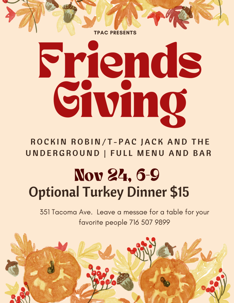 November 24 – “Rockin Robin” Grandin – Friends Giving- Optional Turkey special small and large tables available for reservation!