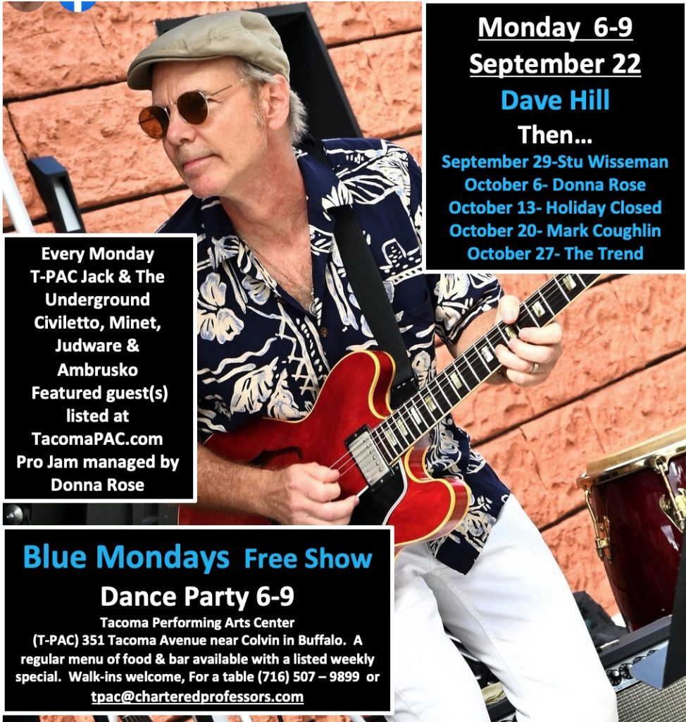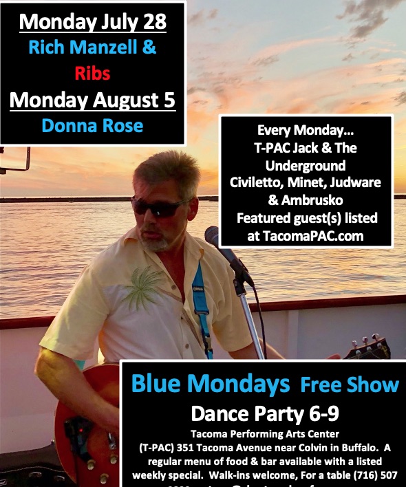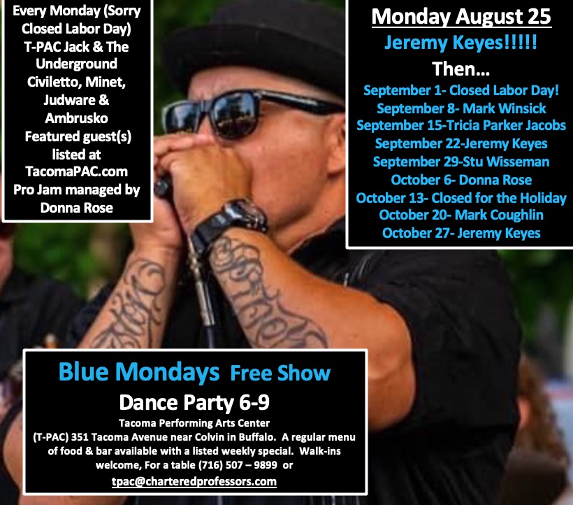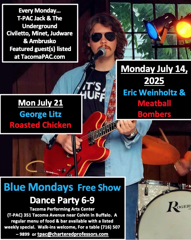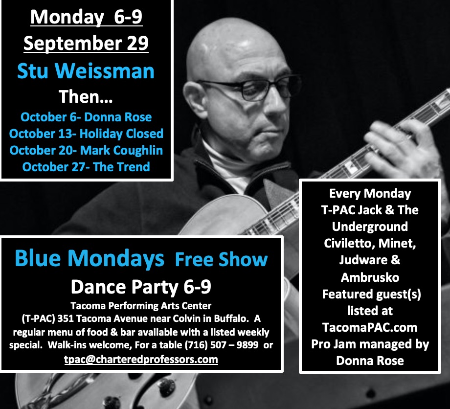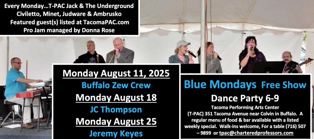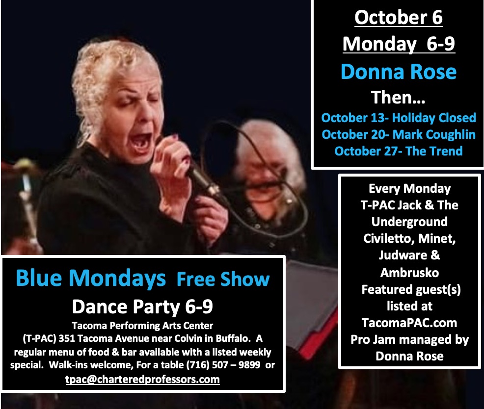 Join us each Monday in the Grand Room in the lower level of the Tacoma Performing Arts Center (T-PAC) at The Charter Place, 351 Tacoma Avenue, Buffalo 14216. If you are a musician and would like to perform in the professional jam, let Donna Rose know.
