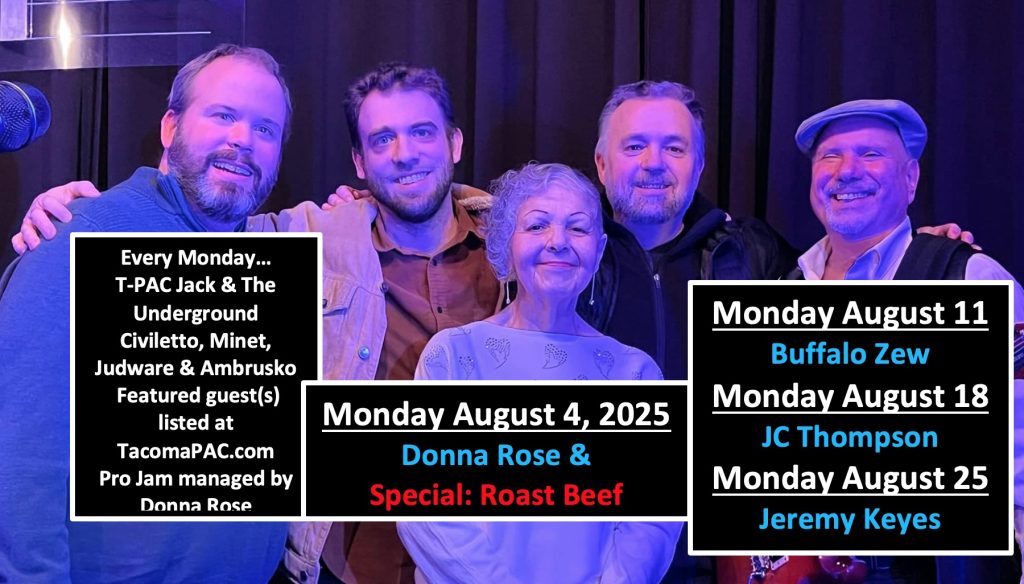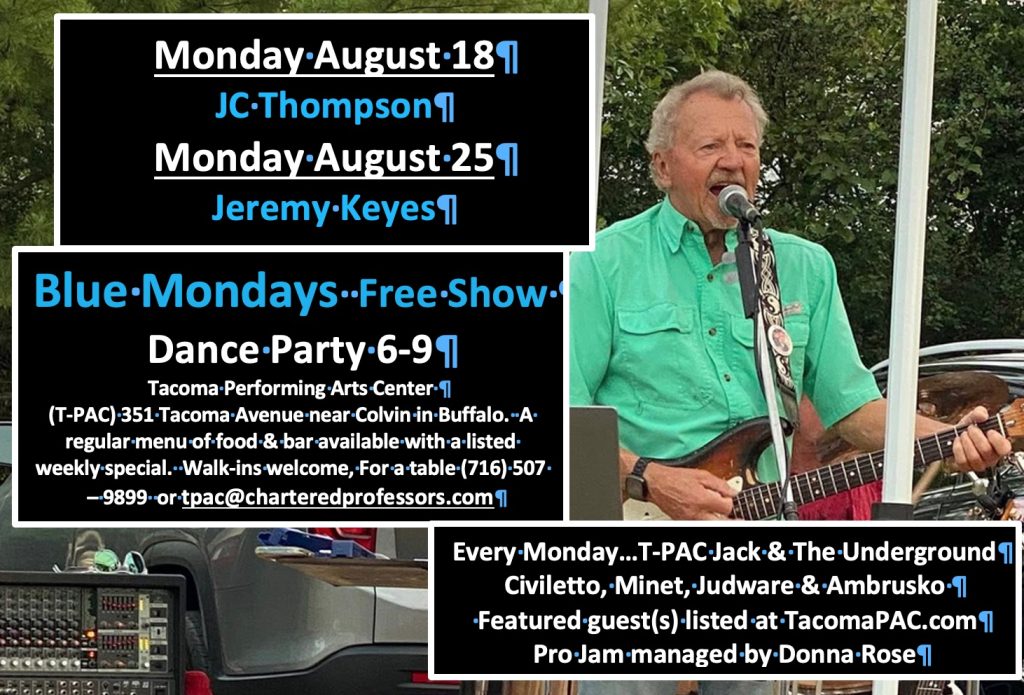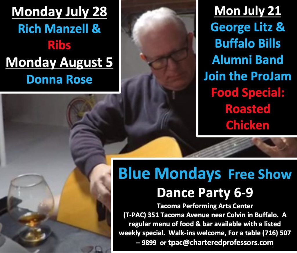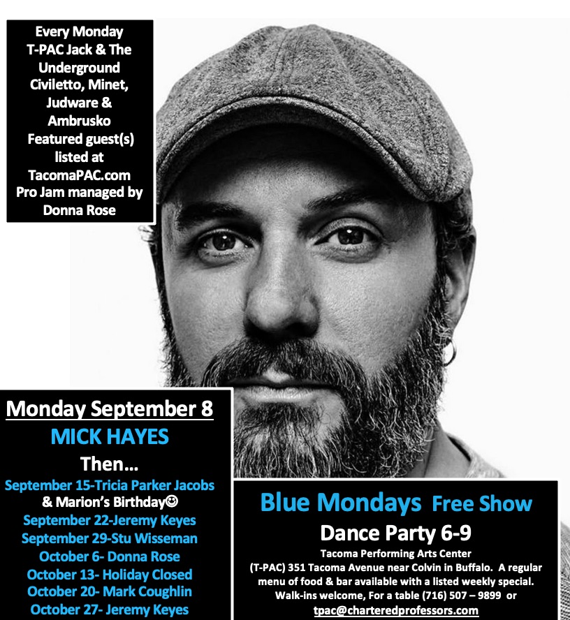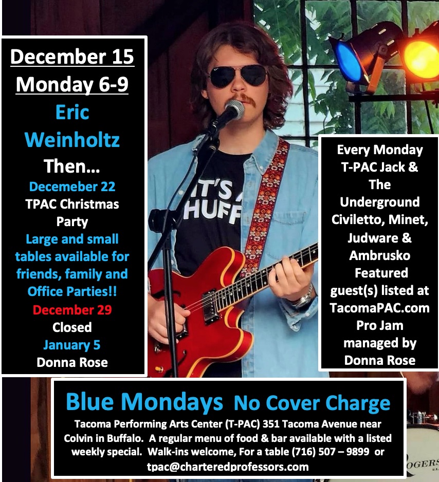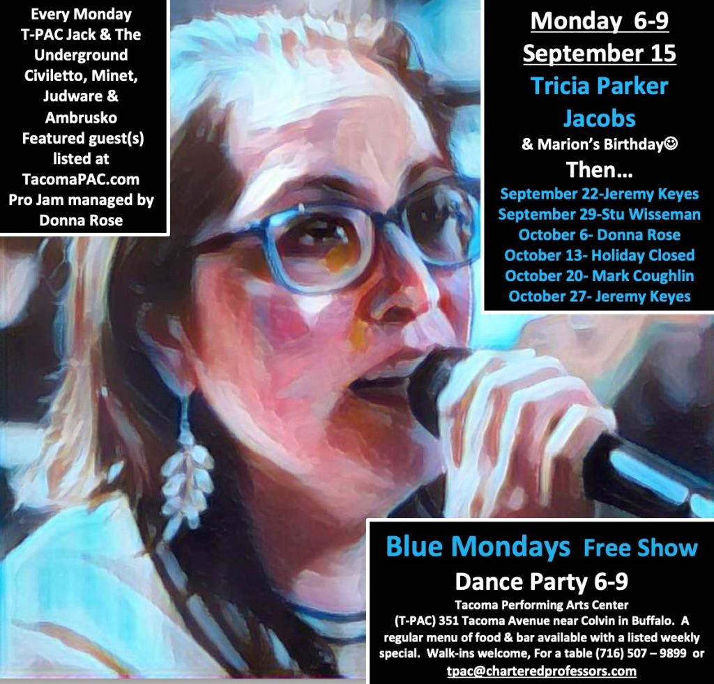 Join us each Monday in the Grand Room in the lower level of the Tacoma Performing Arts Center (T-PAC) at The Charter Place, 351 Tacoma Avenue, Buffalo 14216. If you are a musician and would like to perform in the professional jam, let Donna Rose know.